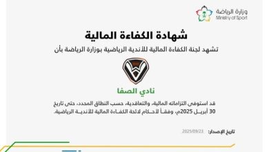 نادي الصفا يحصل على شهادة الكفاءة المالية من وزارة الرياضة 25 سبتمبر 2025 ــ 2:14 م | سبورت- نبيل الخالد…